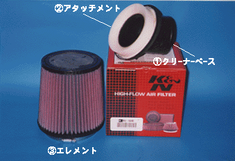 部品は@クリーナーベースとAアタッチメントとBエレメントです。 ノーマルのエアクリーナーは集塵効果が高いので、エンジン保護のためにも、 普段はノーマルエアクリーナーの使用をお勧めします。